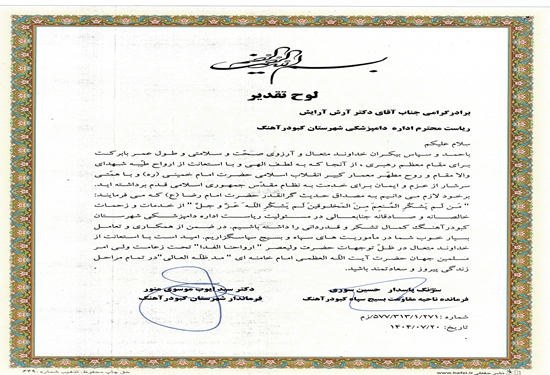 به گزارش روابط عمومی اداره دامپزشکی شهرستان کبودرآهنگ ؛ دکتر سید ایوب موسوی منور فرماندار و جناب سرهنگ حسین سوری فرمانده ناحیه مقاومت بسیج سپاه شهرستان به صورت مشترک در طی مراسمی از دکتر آرش آرایش رئیس اداره دامپزشکی کبودرآهنگ به پاس زحمات شبانه روزی و تلاش های مؤثر ، مستمر در حوزه سلامت دام و ارتقای بهداشت عمومی تقدیر نمودند.